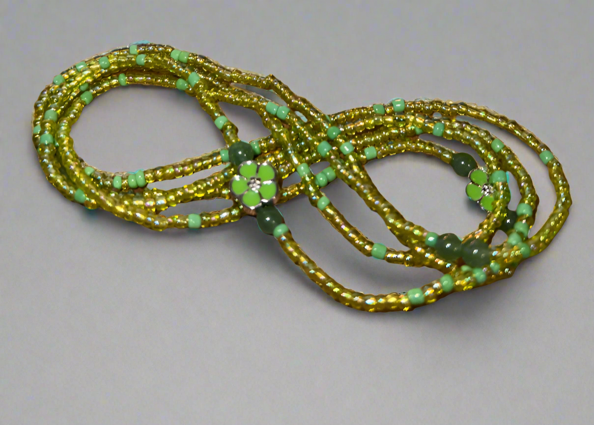 Eye-catching yellow-green no pinch beads, jade accents and flower charms that bring just a touch of adorableness to the mix.